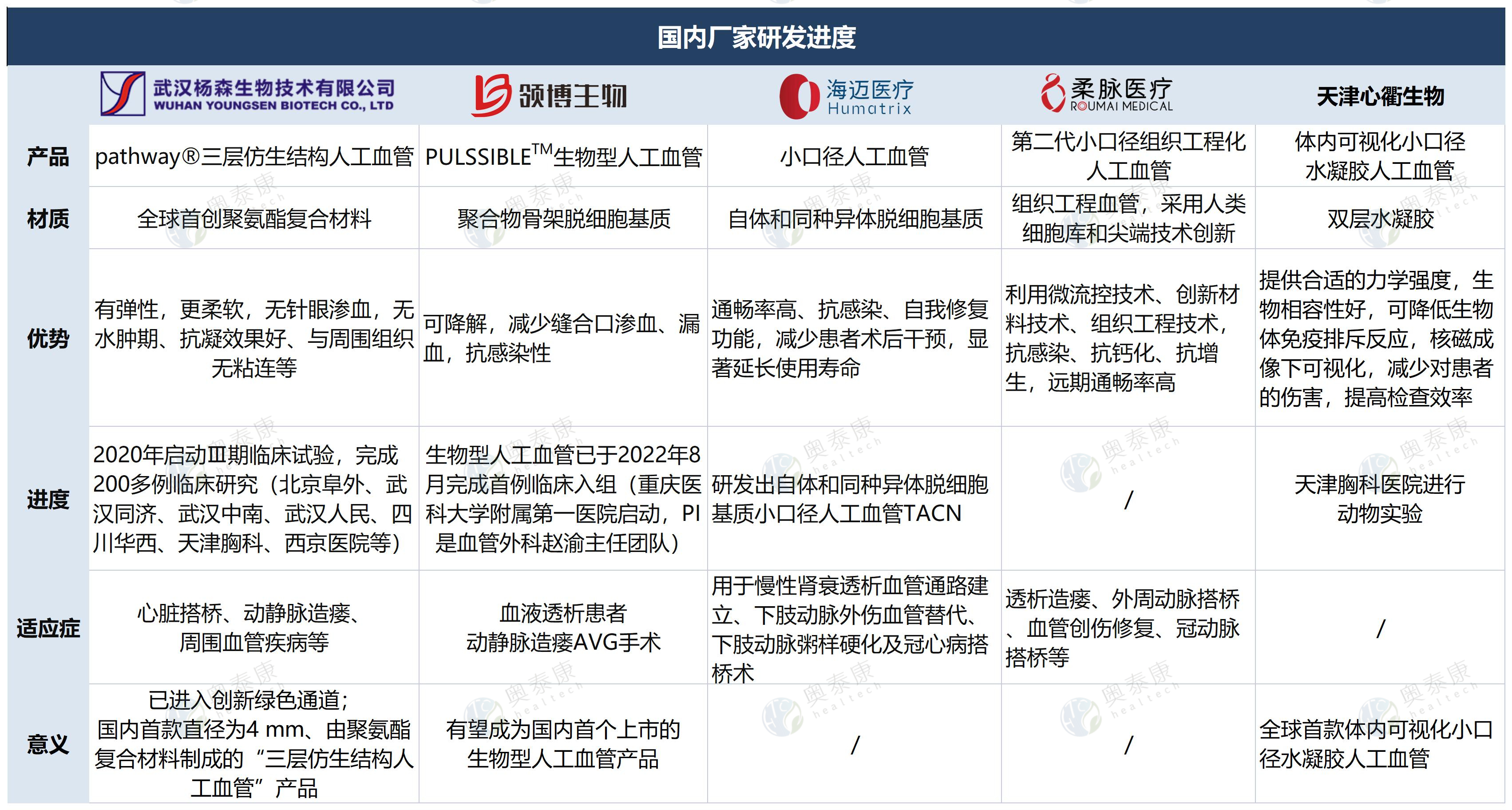 國內(nèi)很多的組織工程小口徑血管產(chǎn)品也正在研發(fā)——武漢楊森的由聚氨酯復(fù)合材料制成的“三層仿生結(jié)構(gòu)人工血管”產(chǎn)品、領(lǐng)博生物公司的生物型脫細(xì)胞人造血管(SAV)、海邁醫(yī)療的自體和同種異體脫細(xì)胞基質(zhì)小口徑人工血管、柔脈醫(yī)療的小口徑組織工程化人工血管與組織化電子血管等,國內(nèi)企業(yè)的發(fā)力讓我們看到了希望。