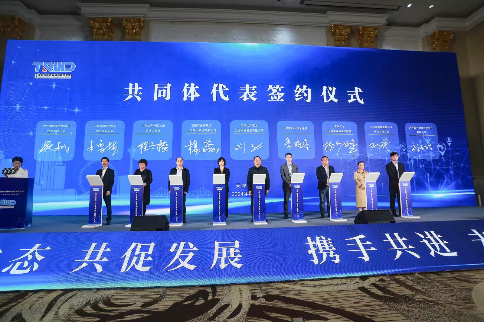 2024年4月24日,由天津市市場監(jiān)督管理委員會、天津市藥監(jiān)局、天津市科技局、天津市衛(wèi)健委、天津市教委、天津市醫(yī)保局和東麗區(qū)區(qū)委區(qū)政府牽頭籌辦的天津高端醫(yī)療器械創(chuàng)新研究院成立大會暨創(chuàng)新轉(zhuǎn)化產(chǎn)業(yè)化公共平臺發(fā)布會于天津順利舉行。奧泰康集團副總王成珍女士受邀參加成立大會,并出席天津高端醫(yī)療器械創(chuàng)新研究院共同體代表簽約儀式。