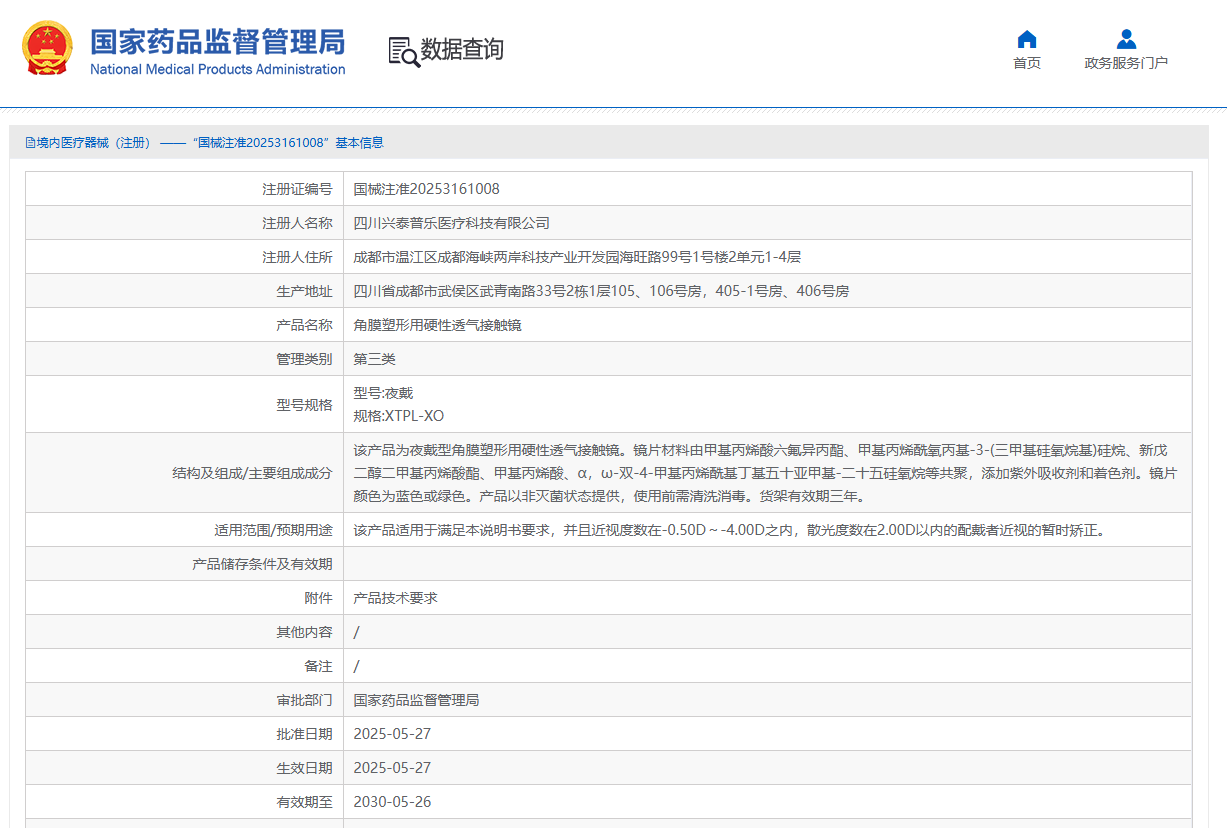 奧泰康助力興泰普樂(lè)「角膜塑形用硬性透氣接觸鏡」獲批上市2025年5月27日,經(jīng)國(guó)家藥品監(jiān)督管理局公示,四川興泰普樂(lè)醫(yī)療科技有限公司的角膜塑形用硬性透氣接觸鏡(國(guó)械注準(zhǔn)20253161008)獲得NMPA批準(zhǔn)上市,奧泰康負(fù)責(zé)本項(xiàng)目臨床試驗(yàn)工作。
