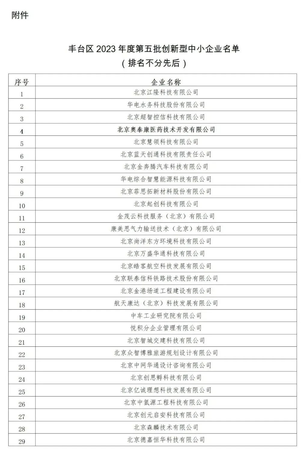 奧泰康入選豐臺(tái)區(qū)2023年度第五批創(chuàng)新型中小企業(yè)名單