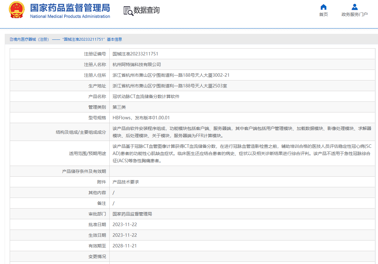 近日,國(guó)家藥監(jiān)局網(wǎng)站公開(kāi)發(fā)布了最新一批三類醫(yī)療器械批準(zhǔn)清單,杭州阿特瑞科技有限公司研發(fā)的《冠狀動(dòng)脈CT血流儲(chǔ)備分?jǐn)?shù)計(jì)算軟件》(簡(jiǎn)稱FFRCT)已經(jīng)獲批上市(圖1),該軟件核心算法完全自主研發(fā),不受制于人。該產(chǎn)品由中美團(tuán)隊(duì)聯(lián)合研發(fā),雙院士團(tuán)隊(duì)臨床驗(yàn)證,是目前國(guó)內(nèi)唯一采用全三維流體力學(xué)方程+超級(jí)計(jì)算機(jī)計(jì)算且被商業(yè)保險(xiǎn)公司認(rèn)可的產(chǎn)品,也是目前被國(guó)家藥監(jiān)局認(rèn)可不需要在“灰區(qū)”(介于0.75至0.85)冠脈彌漫性病變進(jìn)一步研究的無(wú)創(chuàng)醫(yī)療產(chǎn)品。