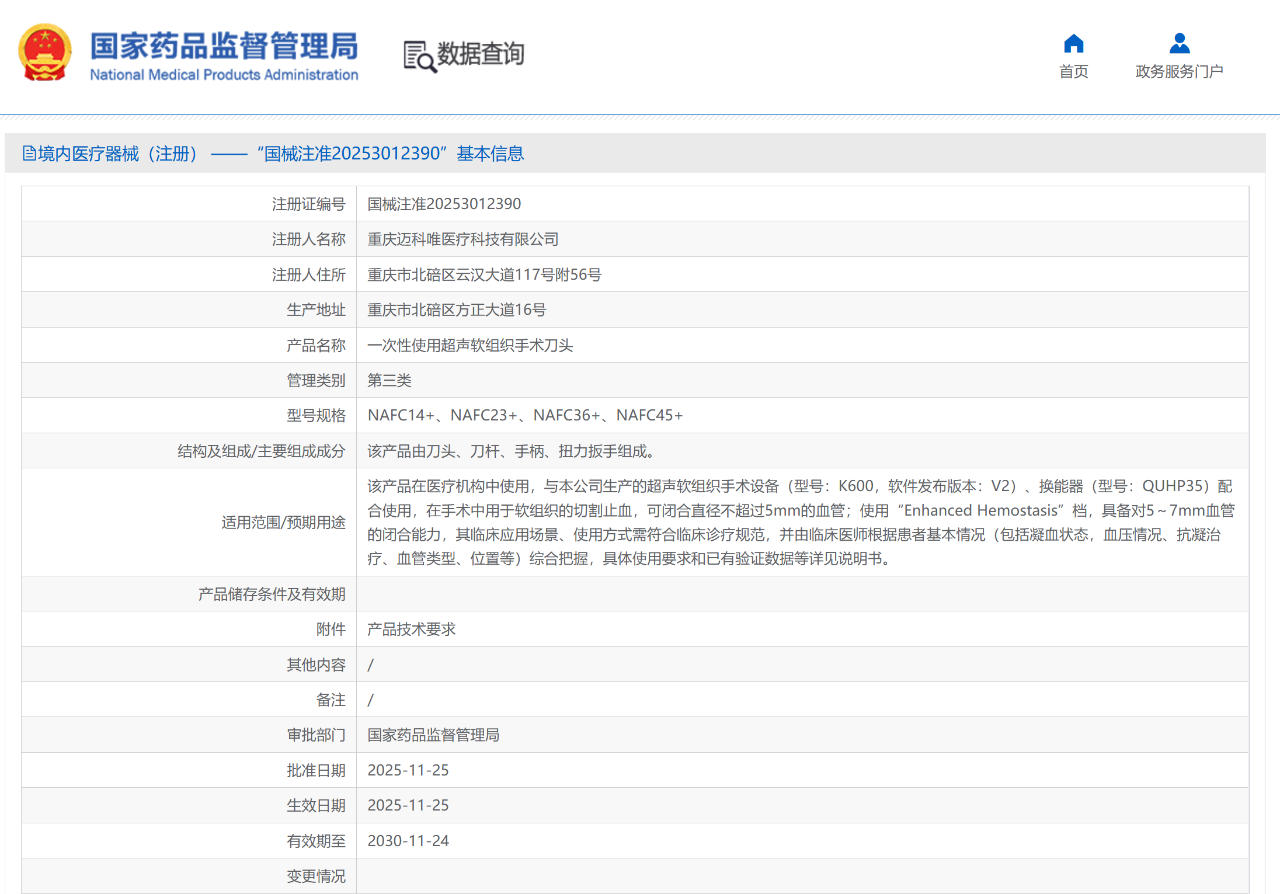 2025年11月,經(jīng)國家藥品監(jiān)督管理局公示,重慶邁科唯醫(yī)療科技有限公司研發(fā)的一次性使用超聲軟組織手術(shù)刀頭(國械注準(zhǔn)20253012390)獲得NMPA批準(zhǔn)上市,奧泰康提供市場(chǎng)準(zhǔn)入MA解決方案。